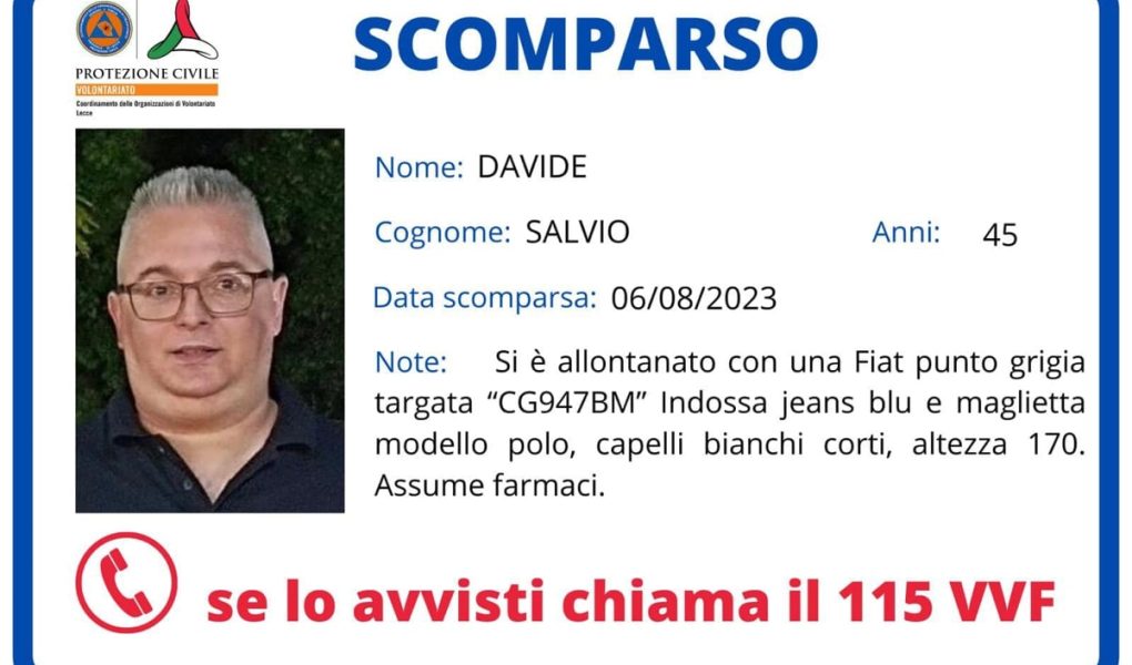 GALATONE – Non si hanno notizie da circa 30 ore di Davide Salvio, 45enne residente a Galatone: si è infatti allontanato dalla sua abitazione intorno alle 11.30 di domenica, a bordo di un’utilitaria, una Punto di colore grigio (targa CG947BM).