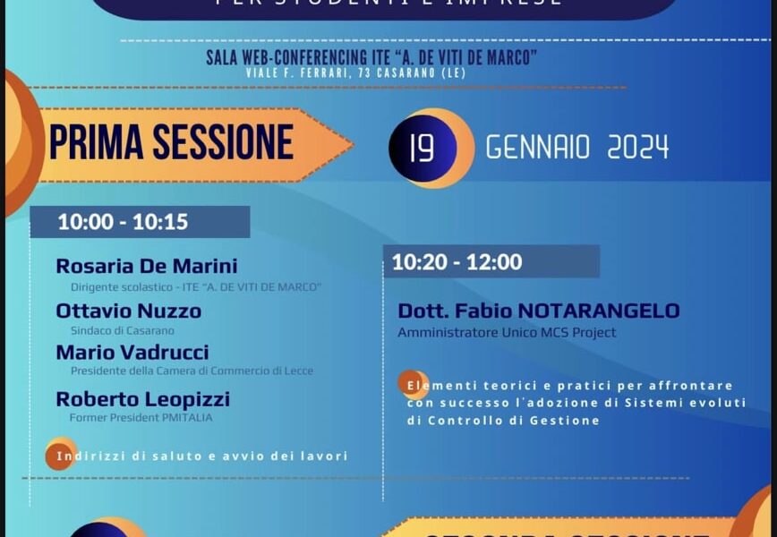 CASARANO – Venerdì 19 e 26 gennaio si svolgerà, presso Istituto Tecnico Economico “ A. De Viti De Marco” di Casarano (Le), il ciclo di workshop destinato congiuntamente a studenti e imprese, che si confronteranno sulle nuove sfide dei più evoluti Sistemi di Controllo di Gestione Aziendale. Frutto…